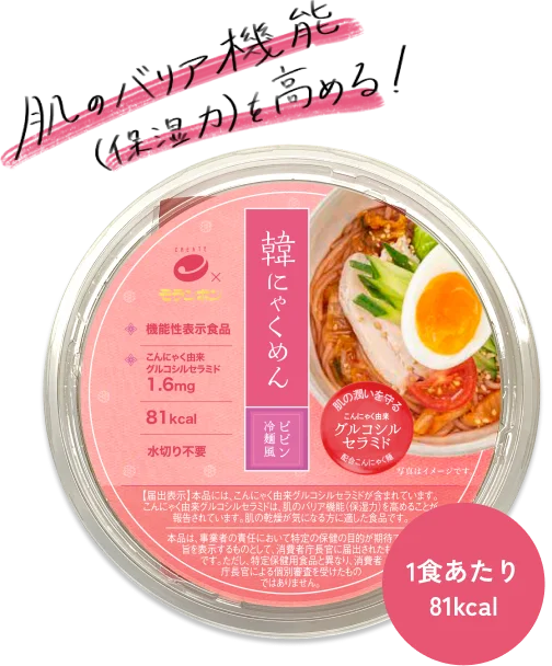 韓にゃくめんで韓国美人♪モランボン㈱と共同開発した韓にゃくめん登場!こんにゃく由来のグルコシルセラミドが摂取できる機能性表示食品。肌のバリア機能(保湿力)を高めることができるこんにゃく麺です。お肌のインナーケアに興味のある方におすすめです。
