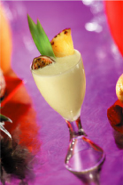 材料をシェークし、グラスに注ぐ。パイナップルのスライスと葉の部分、パッション・フルーツ1/2カットを添える。