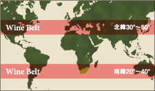 南アフリカのブドウ栽培地域は南緯34度を中心に位置しています。これはチリ、アルゼンチン、オーストラリアなどのワイン産地と同緯度。穏やかな地中海性気候、豊富な日照時間、降水量500~800mm、海からの冷たいそよ風。ブドウ栽培に適したすべてがここにあるといわれるほどです。さらに地域ごとに微小気候(マイクロ・クライメット)とヴァラエティーに富んだ土壌(テロワール)が存在するため、それぞれの地区で個性豊かな南アフリカのワインが生み出されています。