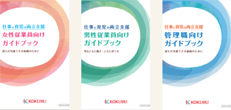 また、女性向け、男性向け、管理職向けと3種類のガイドブックを作成し、引継ぎや復帰の時期、さらには今後の目標設定など、それぞれの段階に併せて、認識を共有できるツールとして活用いただいています。